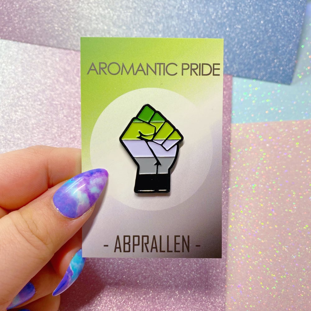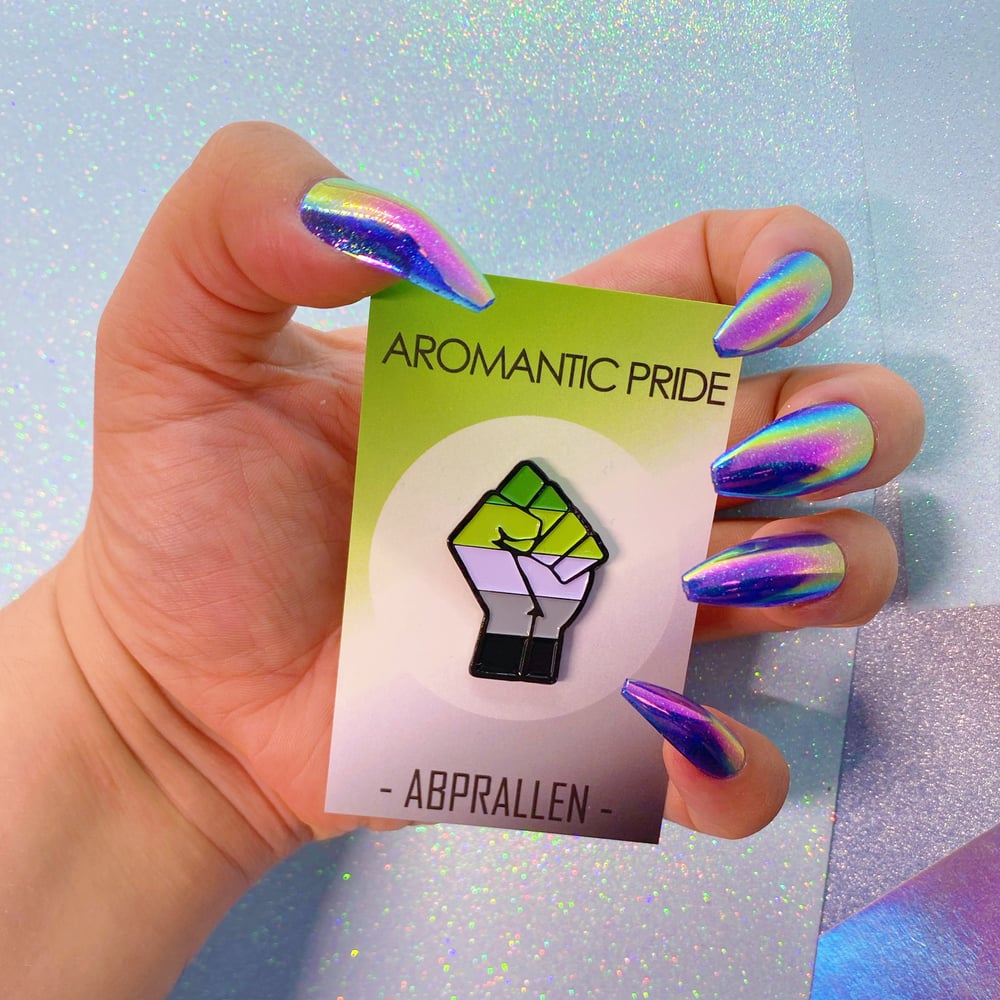 This Pride pin is for all aromantic people, whether you just realised you're aromantic or you've known for years. Your identity is real, valid, and Yours.