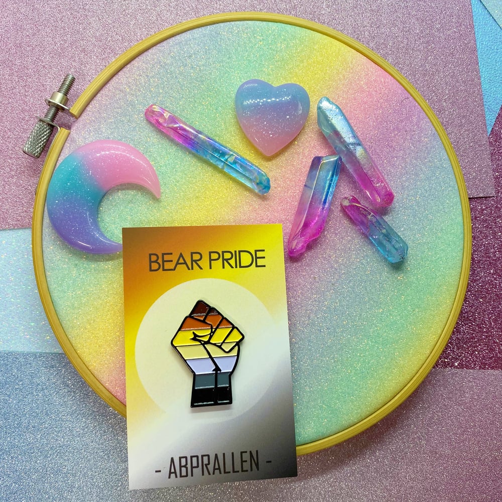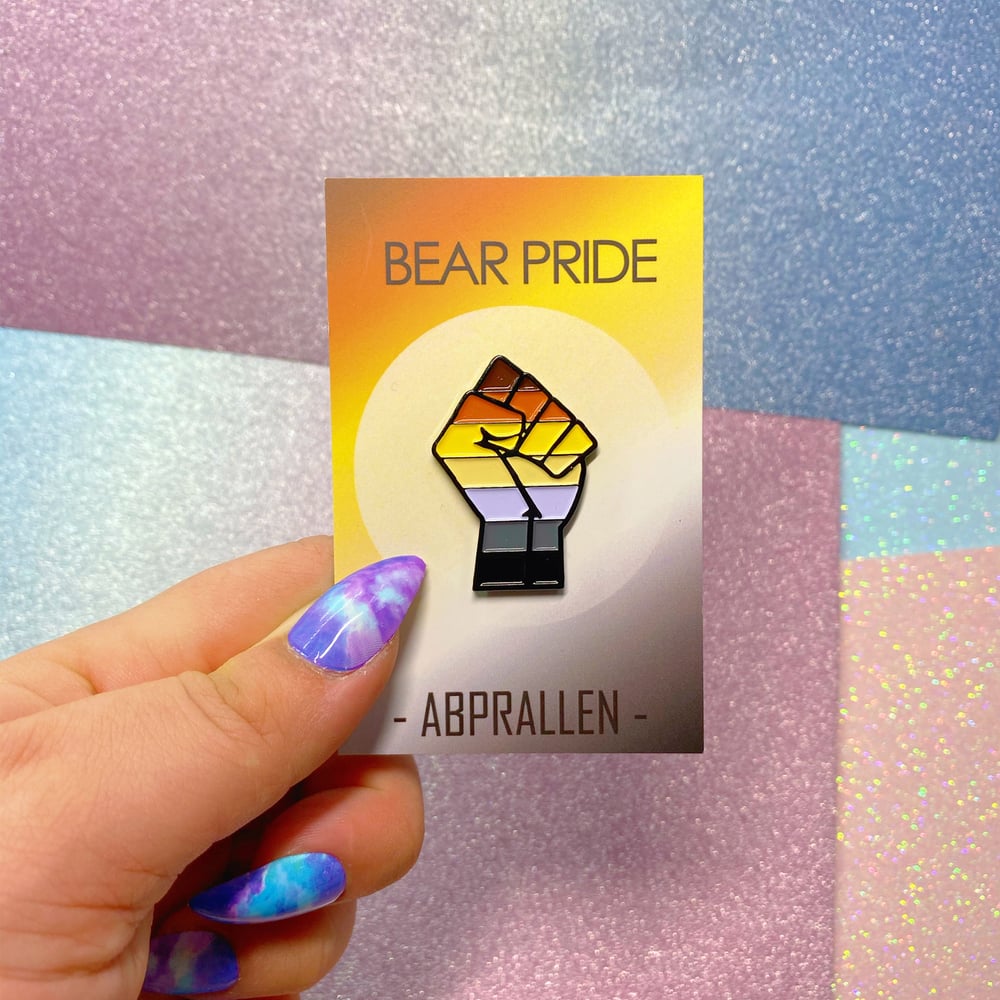 I designed this Bear Pride pin in 2019, following on from the love I received in regards to my Trans Pride pin and have since created a number of other LGBT pride flags in the same style. This pin measures 34mm and affixes to all suitable fabrics such as hats, jackets, shirts, and bags.