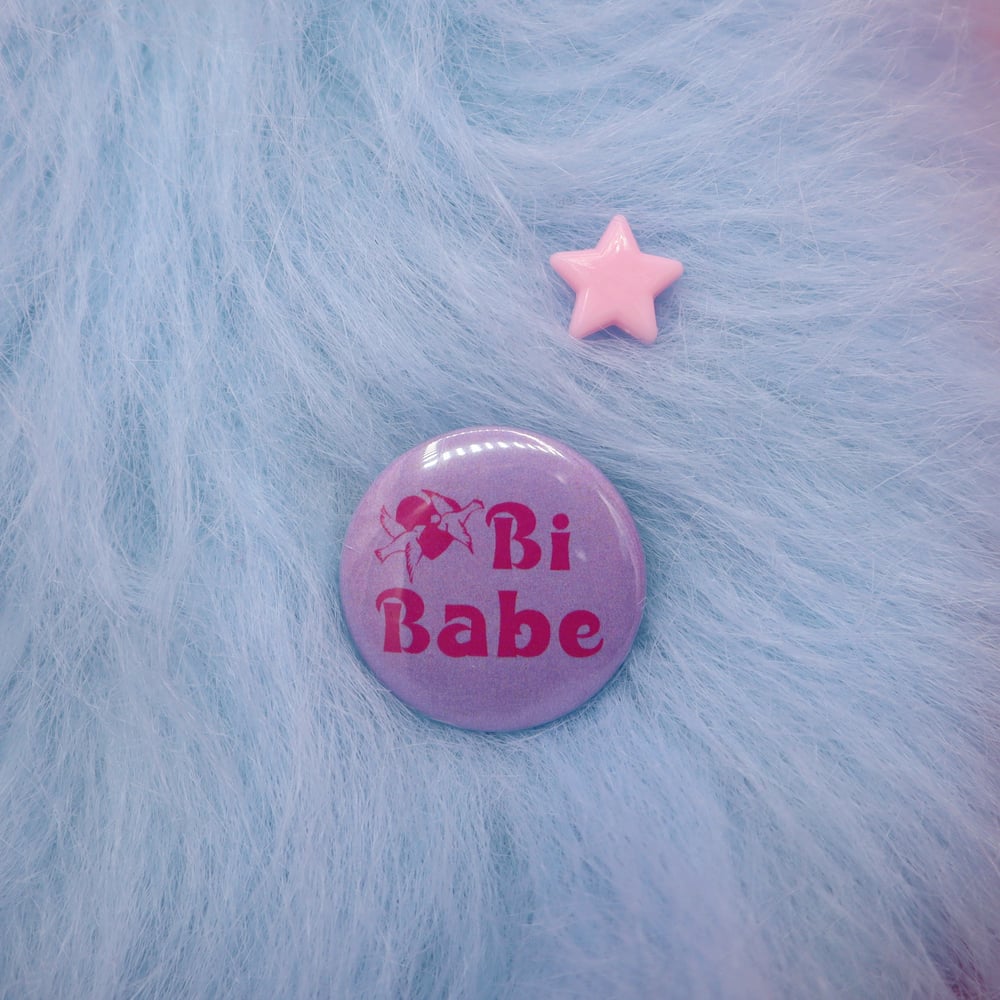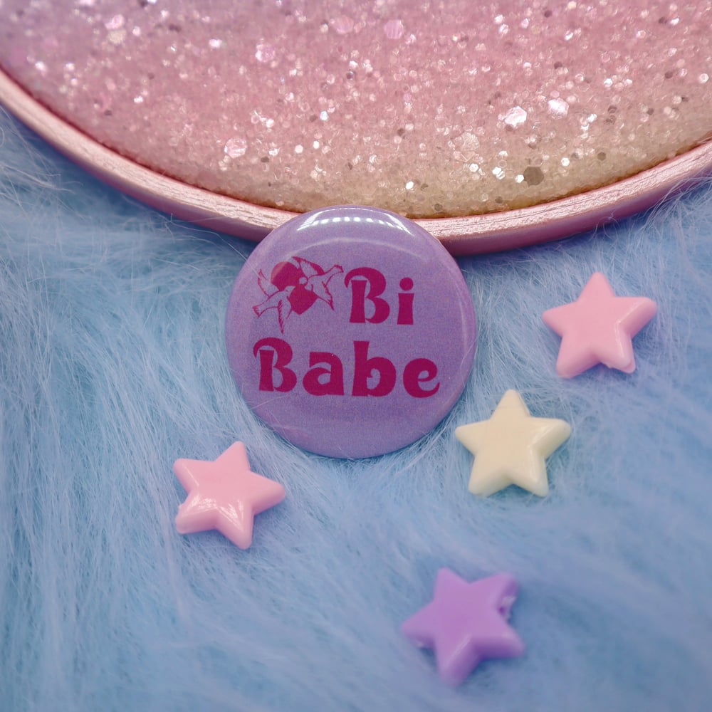 This button badge features the message "Bi Babe". It measures 32mm, and is made to last. Really show off your true colours with this button; attach it to jackets, bags, tees, hats, or anywhere else you can think of.