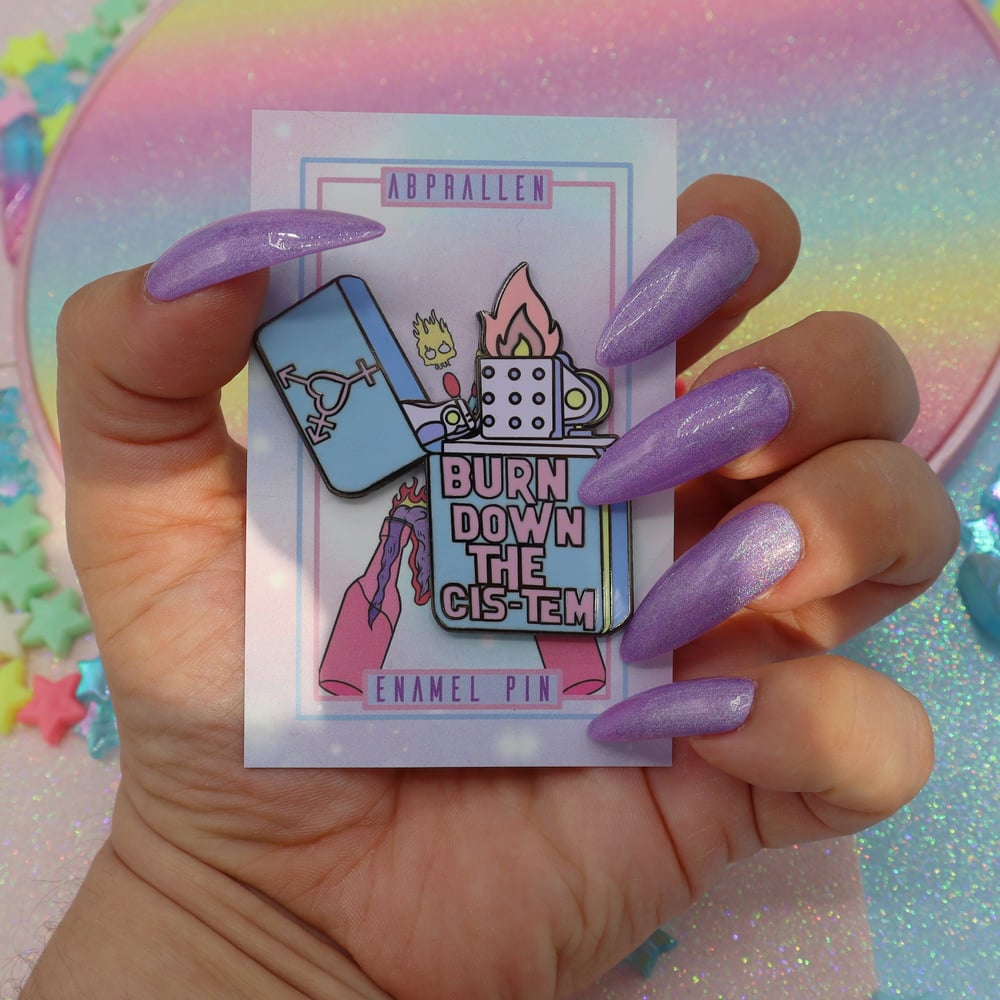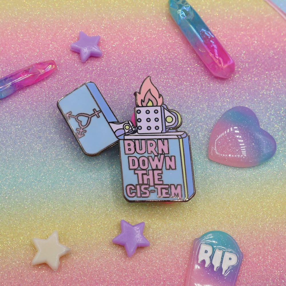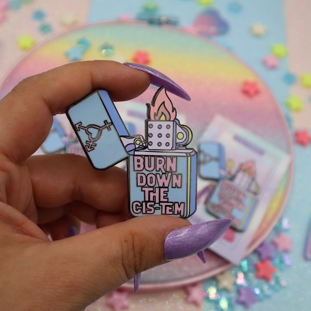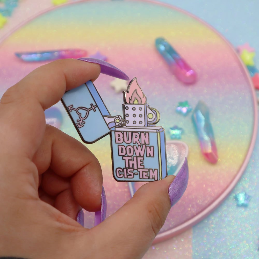 Celebrate resistance and trans pride with this pastel enamel pin, styled after bold trad tattoos - featuring a bright, flaming lighter and the trans symbol combined with a heart because there's nothing more beaufiul than living authentically. The cis-tem is what keeps trans kids from exploring their gender, holds trans people back, and teaches that we aren't beautiful. It must be burned down so that we may rise from the ashes. This pin is perfect for collectors, queer allies and most importantly - trans people who live unapologetically!