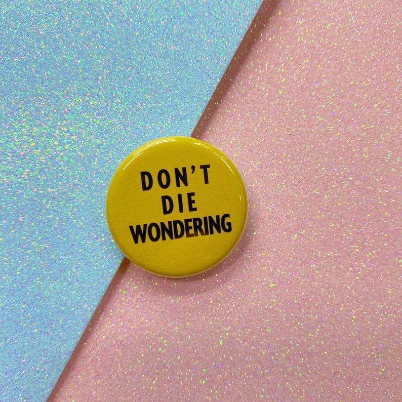 This gay pride button badge is a remake of a pin from the 80s, it features the message "Don't Die Wondering" . It measures 32mm, and is made to last. Really show off your true colours with this button; attach it to jackets, bags, tees, hats, or anywhere else you can think of.
