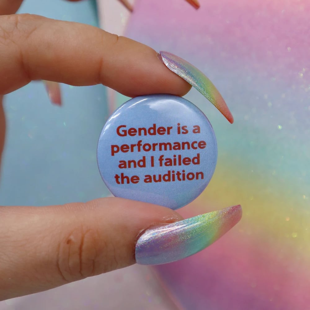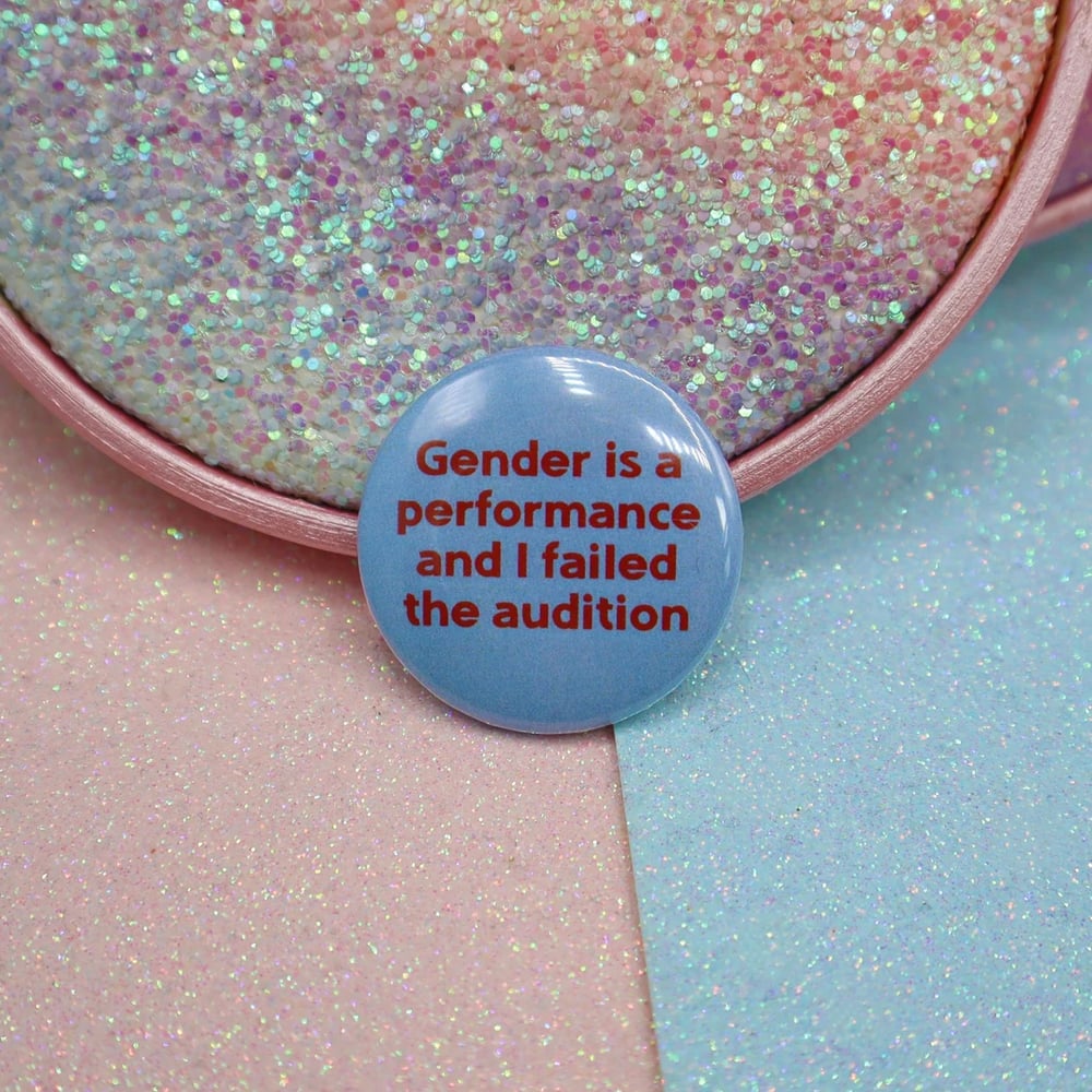 This button badge features the message "Gender Is A Performance And I Failed The Audition". It measures 32mm, and is made to last. Really show off your true colours with this button; attach it to jackets, bags, tees, hats, or anywhere else you can think of.