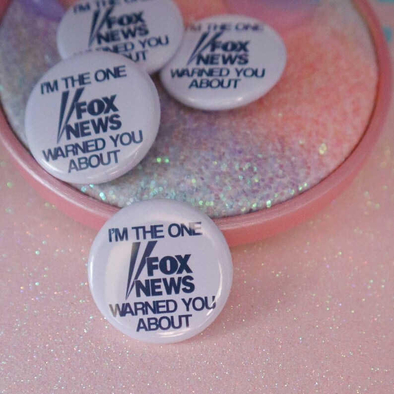 This button badge features the message "I'm The One Fox News Warned You About" because lets be honest, they're always drumming up fear about one marginalised group or another. It measures 32mm, and is made to last. Really show off your true colours with this button; attach it to jackets, bags, tees, hats, or anywhere else you can think of.