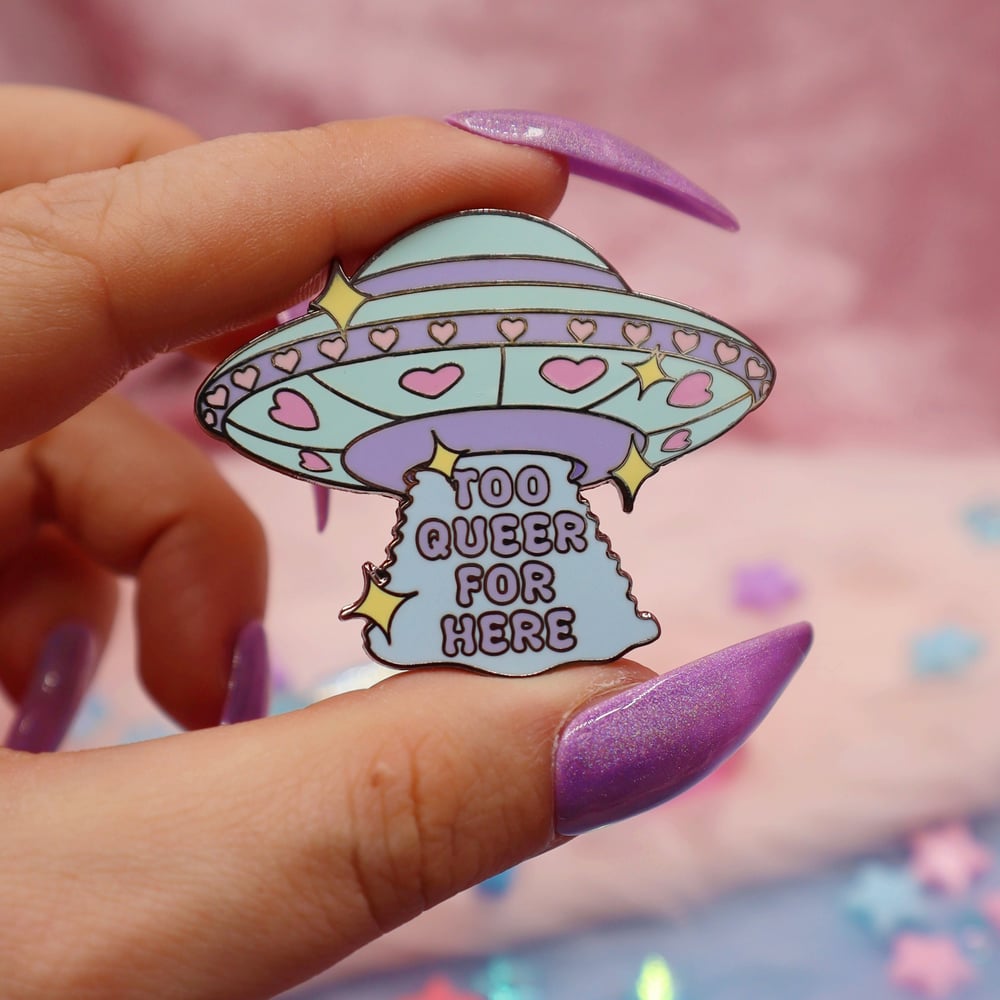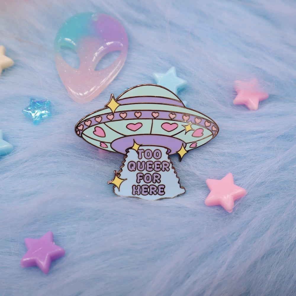 This hard enamel pin measures 39mm at its largest point and affixes at the back with two rubber clasps. As with all of my pins it comes with its own unique backing card.