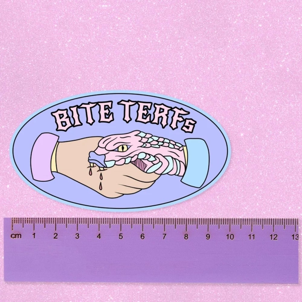This vinyl sticker measures 10cm at its widest point, is weather-resistant and affixes to all smooth surfaces.