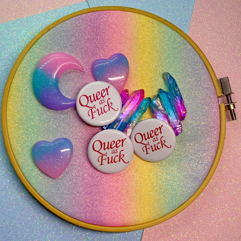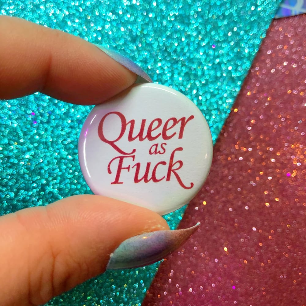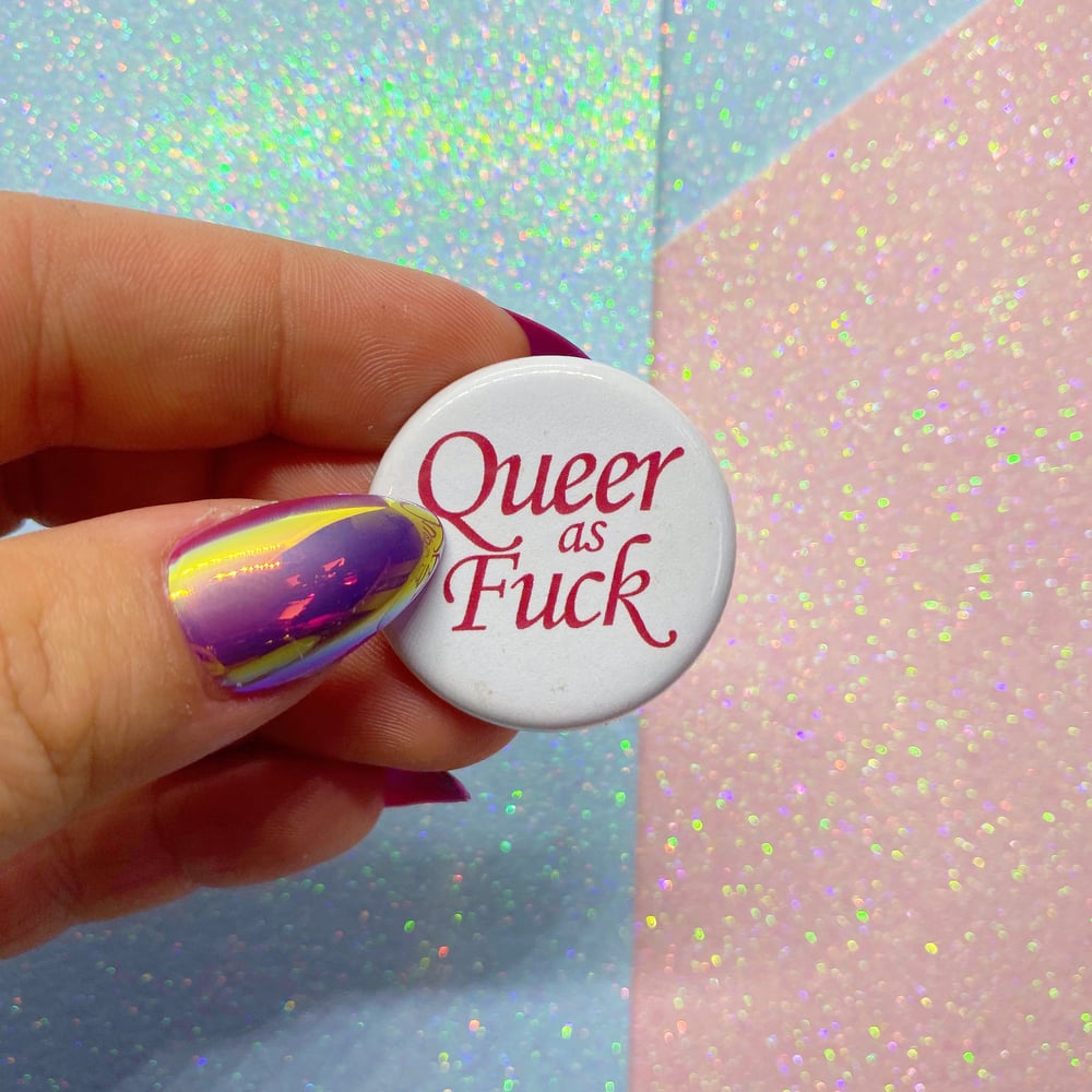 This queer pride button badge is a remake of a pin from 1993 and features the message "Queer as Fuck". It measures 32mm, and is made to last. Really show off your true colours with this button; attach it to jackets, bags, tees, hats, or anywhere else you can think of.