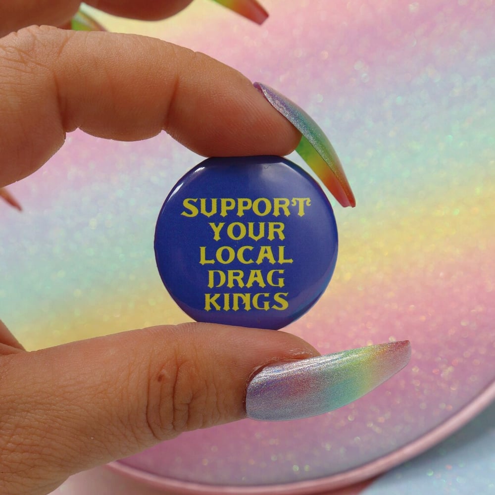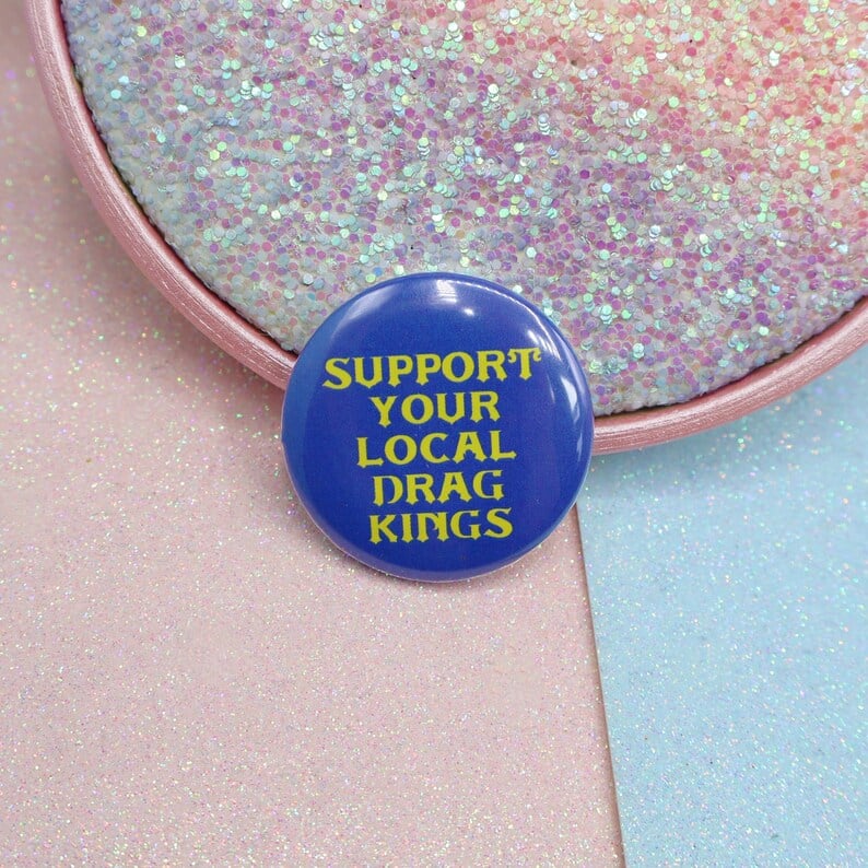 This button badge features the message "Support Your Local Drag Kings". It measures 32mm, and is made to last. Really show off your true colours with this button; attach it to jackets, bags, tees, hats, or anywhere else you can think of.