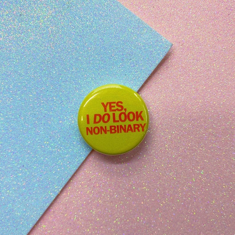 This non-binary pride button badge features the message "Yes, I DO Look Non-Binary". It measures 32mm, and is made to last. Really show off your true colours with this button; attach it to jackets, bags, tees, hats, or anywhere else you can think of.